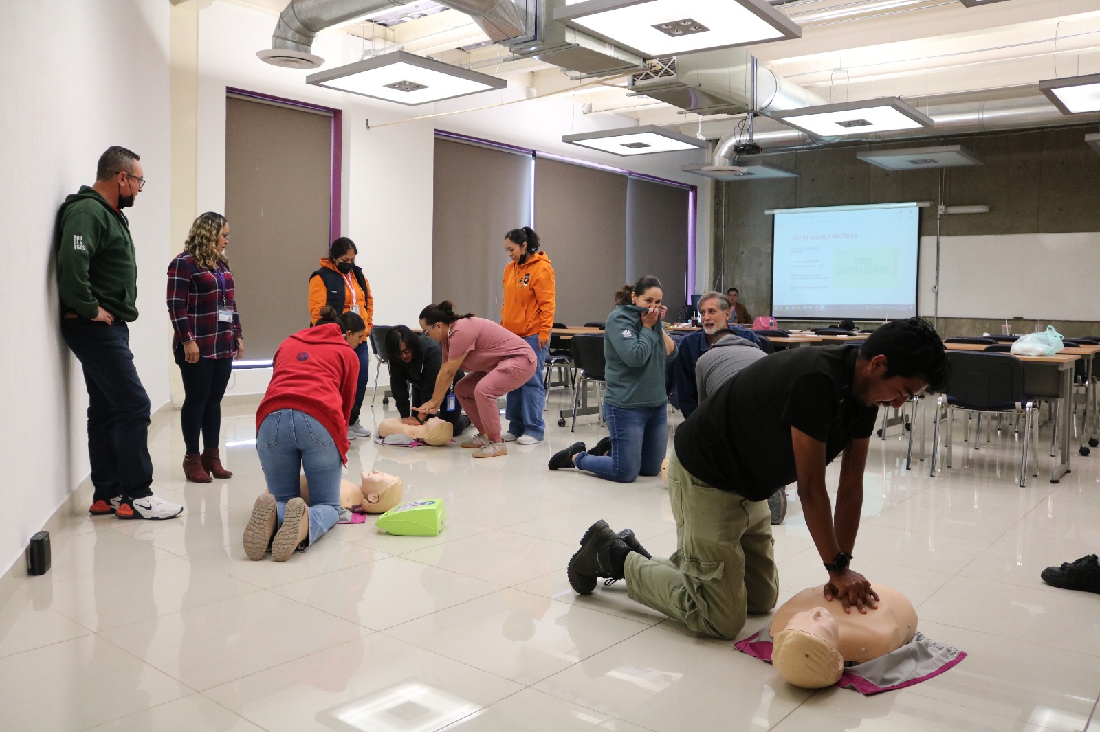 La segunda etapa, realizada de forma presencial los días miércoles 18 y viernes 20 de febrero, fue teórica y práctica. Involucró el uso de maniquíes y un desfibrilador automático de entrenamiento.